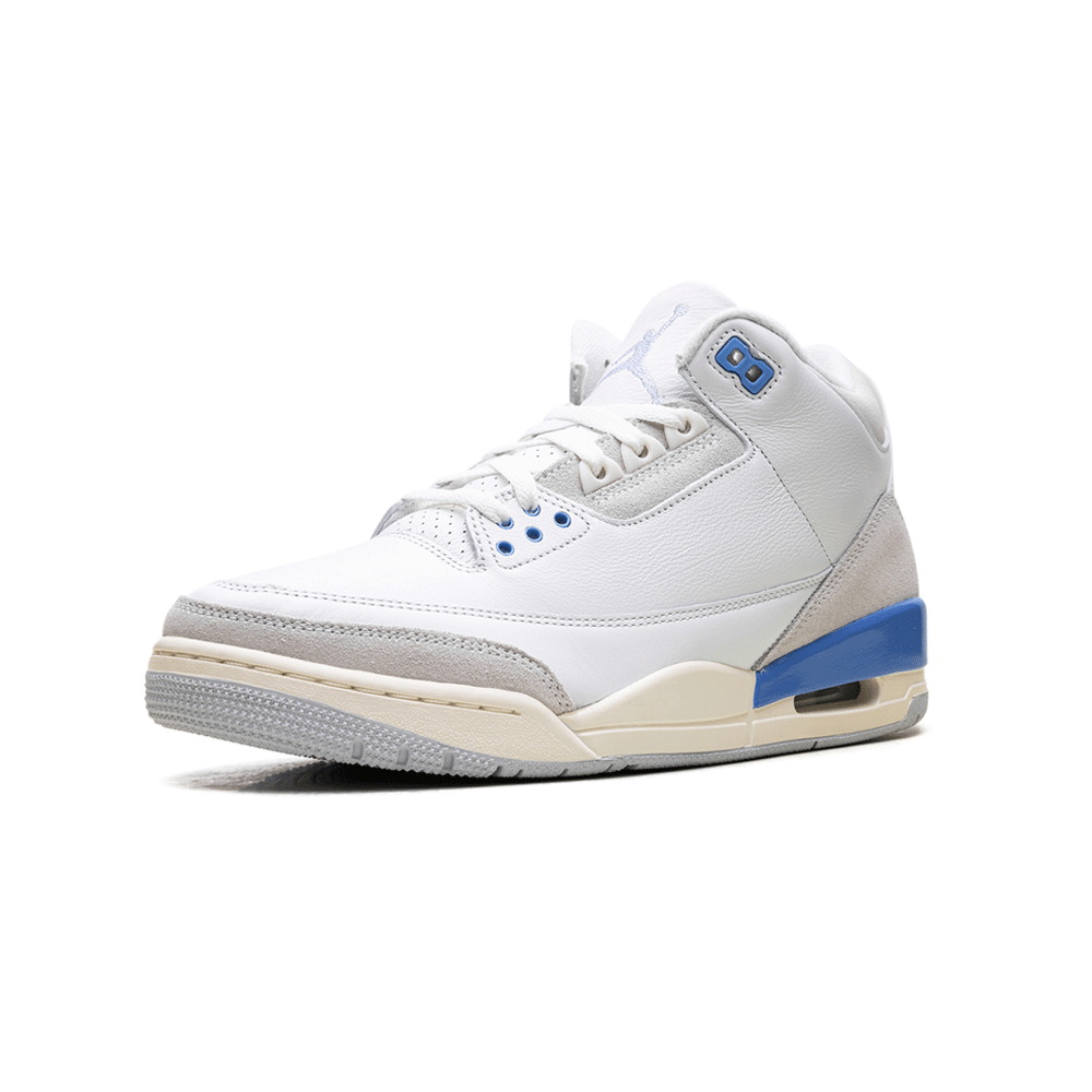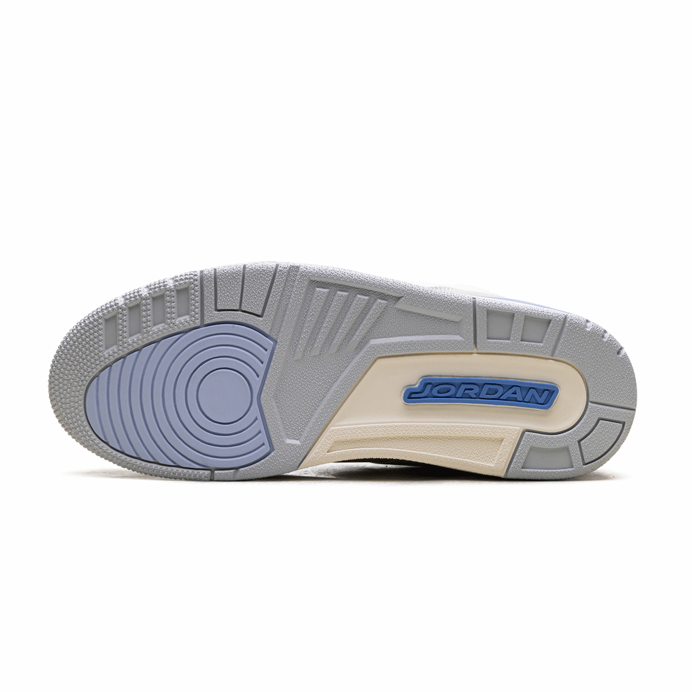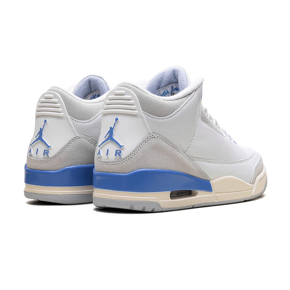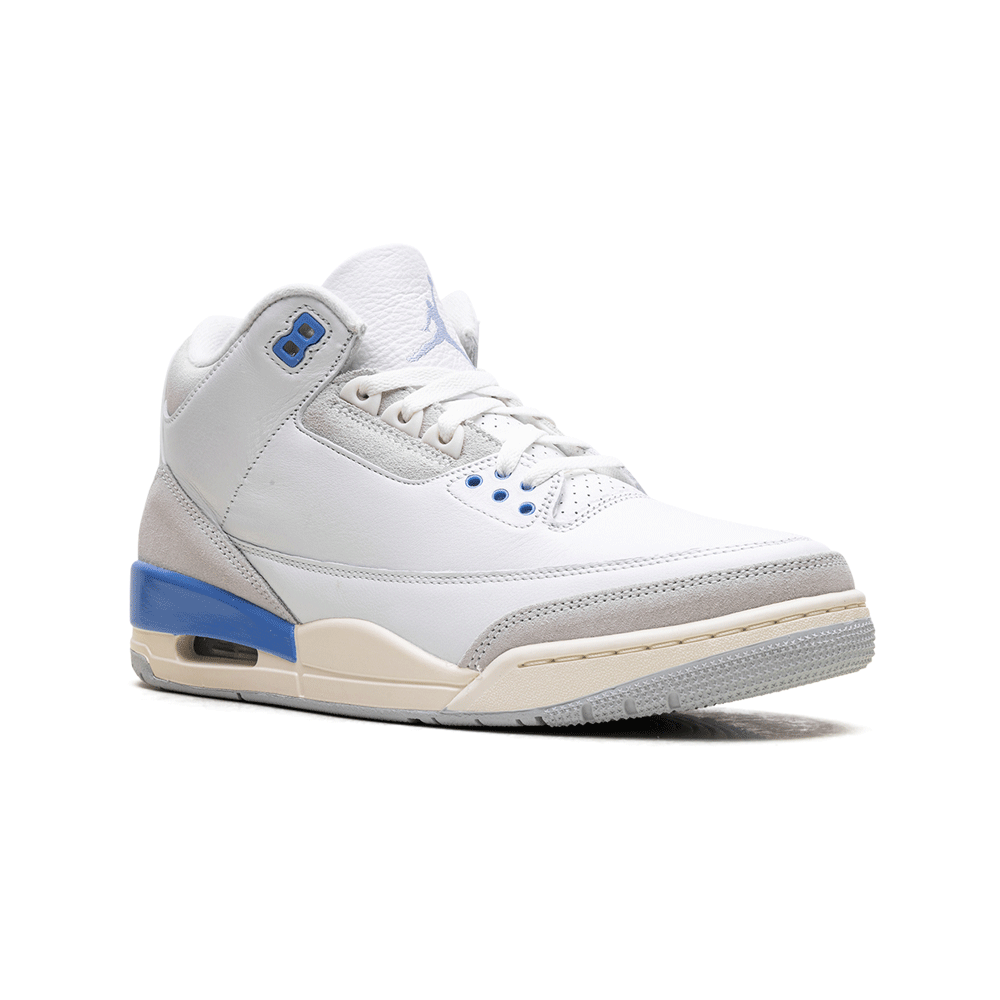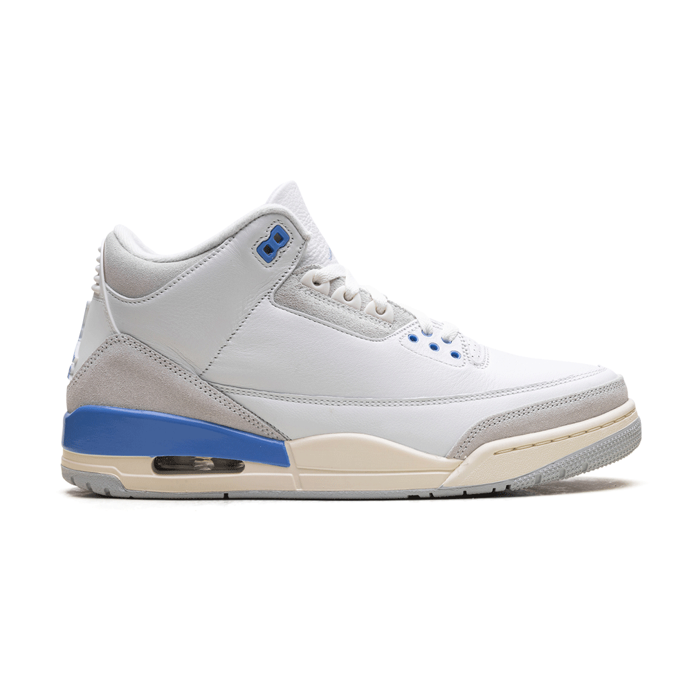 The Air Jordan 3 “Lucky Shorts” is a blue and white colorway of Michael Jordan’s third signature shoe. The “Lucky Shorts” AJ3 takes inspiration from a pair of UNC shorts that Jordan wore underneath his NBA uniform during his carer. The upper on this Jordan 3 mixes white leather with off-white suede and adds Carolina blue accents throughout.